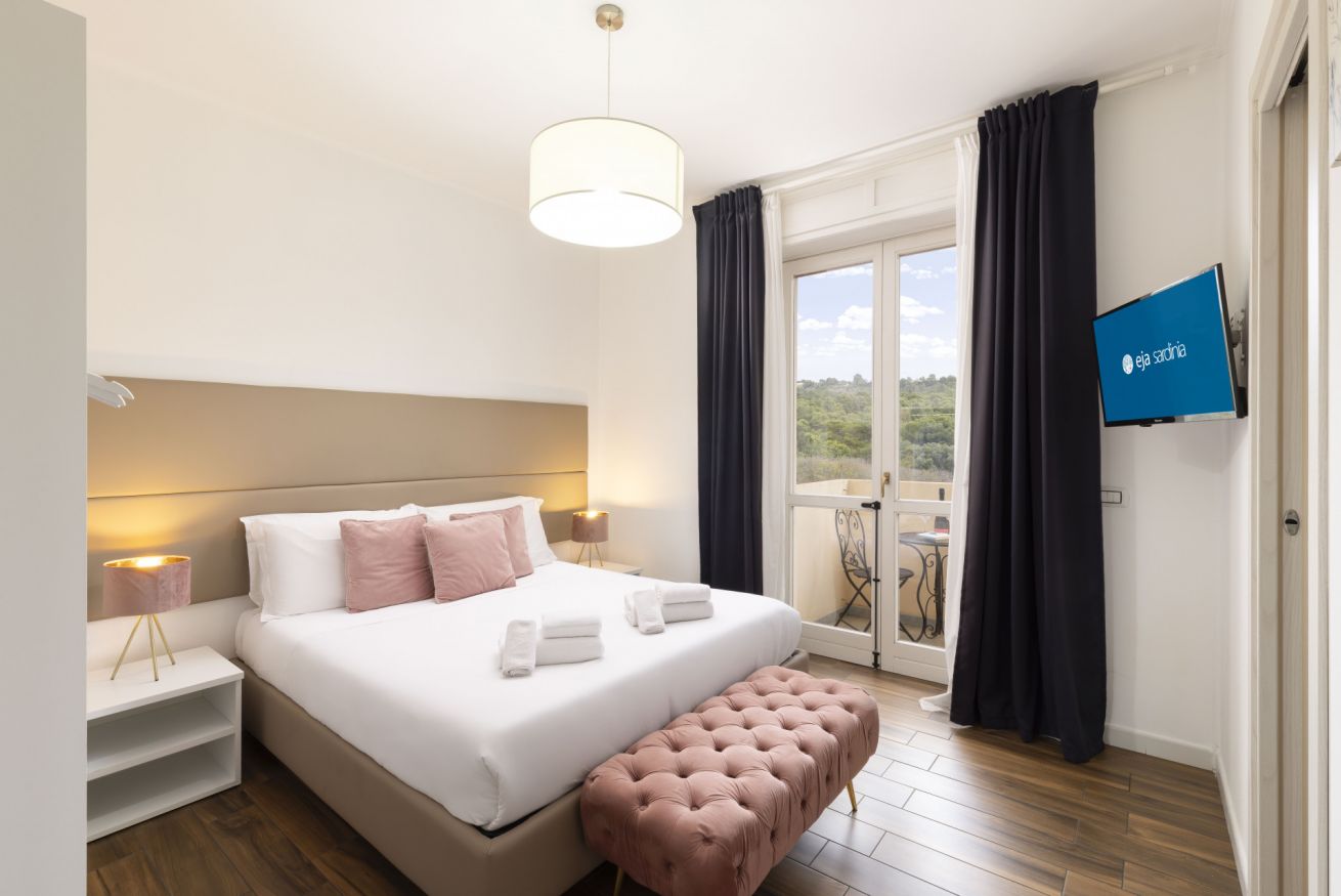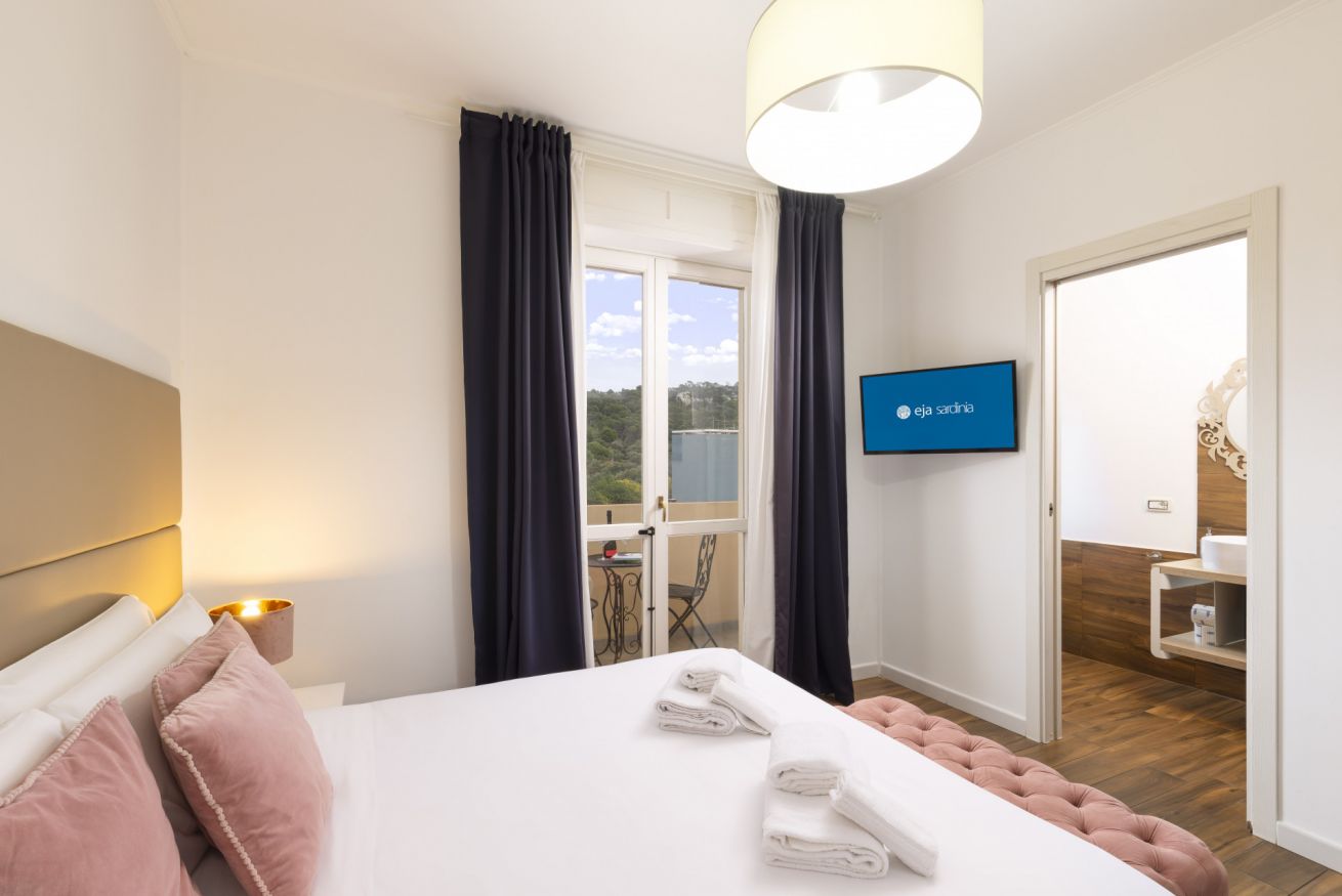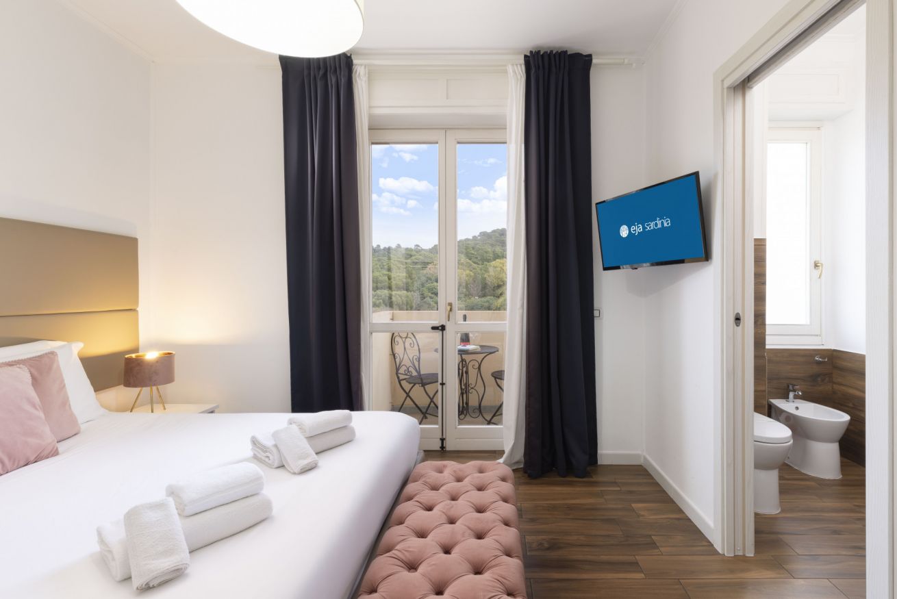 Dispone di balcone con vista su Monte Urpinu, bagno privato con ampia doccia e soffione a pioggia, set completo di asciugamani, asciugacapelli e kit cortesia (shampoo). A vostra disposizione anche Smart TV da 32” a 43”, aria condizionata, Wi-Fi gratuito, mini frigo, bollitore e macchina del caffè.
